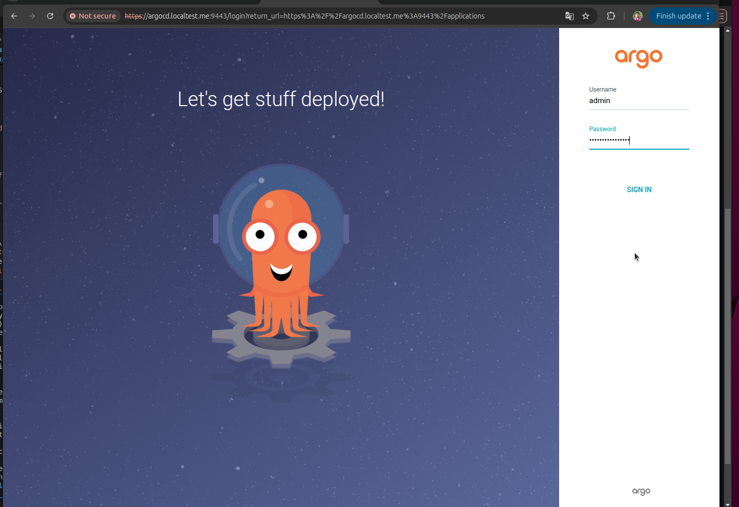 Open your browser and navigate to: https://argocd.localtest.me:9443/